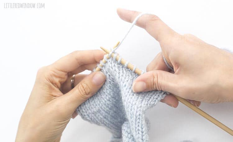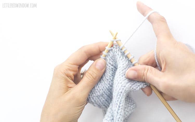 - Continue on and knit the next stitch, while still holding the yarn to the back