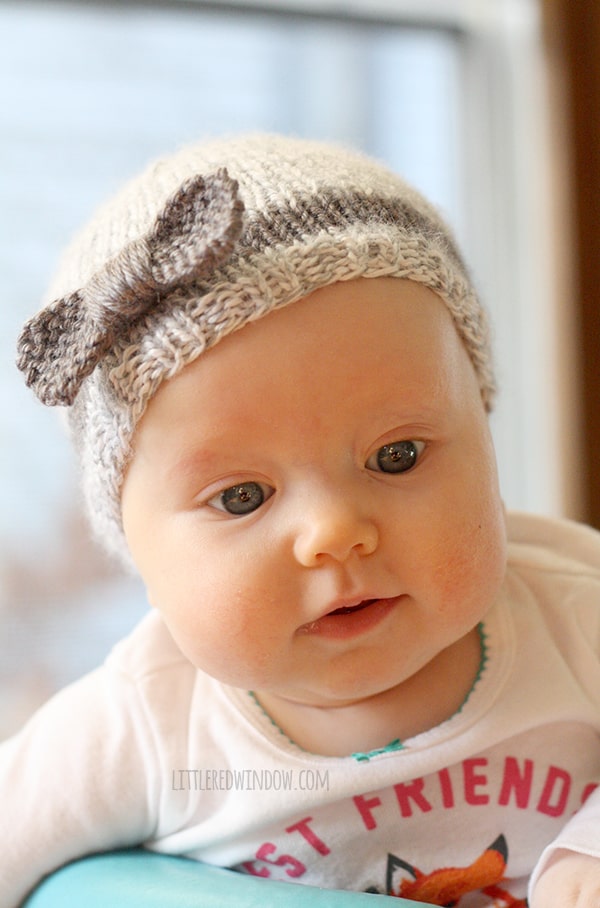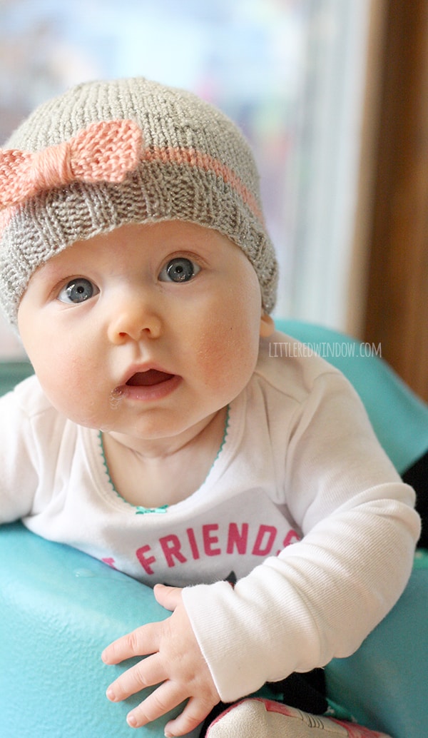 I first saw a baby bow hat on pinterest linked to this post from Twenty Something Granny (which is an awesome blog name, by the way) but it doesn’t look like she’s blogged regularly in almost five years. And that bow baby hat pattern is for a teeny tiny hat for a newborn and is knitted flat and I wanted to make a bigger version for baby V knit in the round.