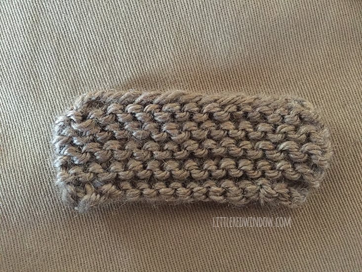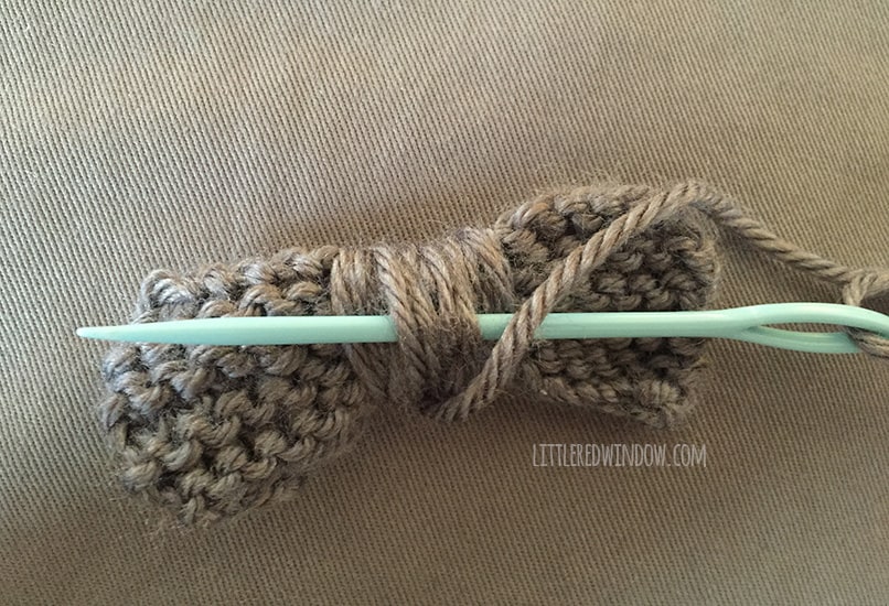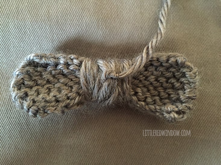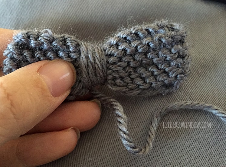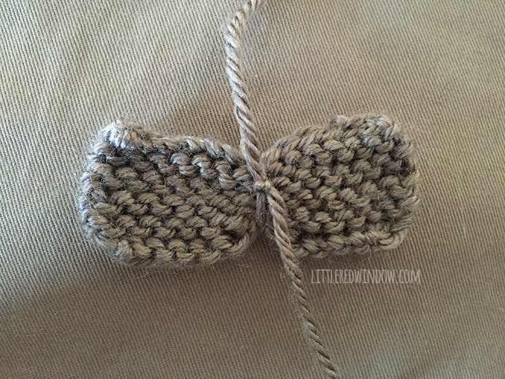Then, take a long piece of yarn and tie it around the middle of the knit rectangle like this:Trim the short end and then wrap the long end around and around the middle of the bow, neatly until the center is as big as you want it. Thread the long end on a yarn needle, turn your bow to the back and insert it through the wound yarn and knot to secure the end. Then, using that same long tail, use your yarn needle to securely stitch the bow to the front of the hat on the stripe. Make sure you attach it really well since this is an item for babies.