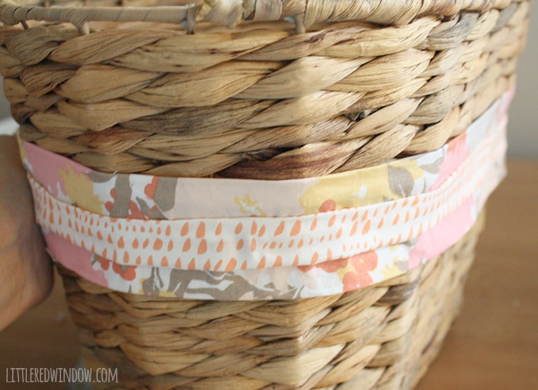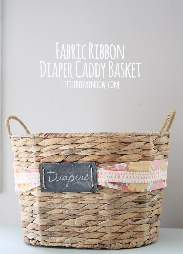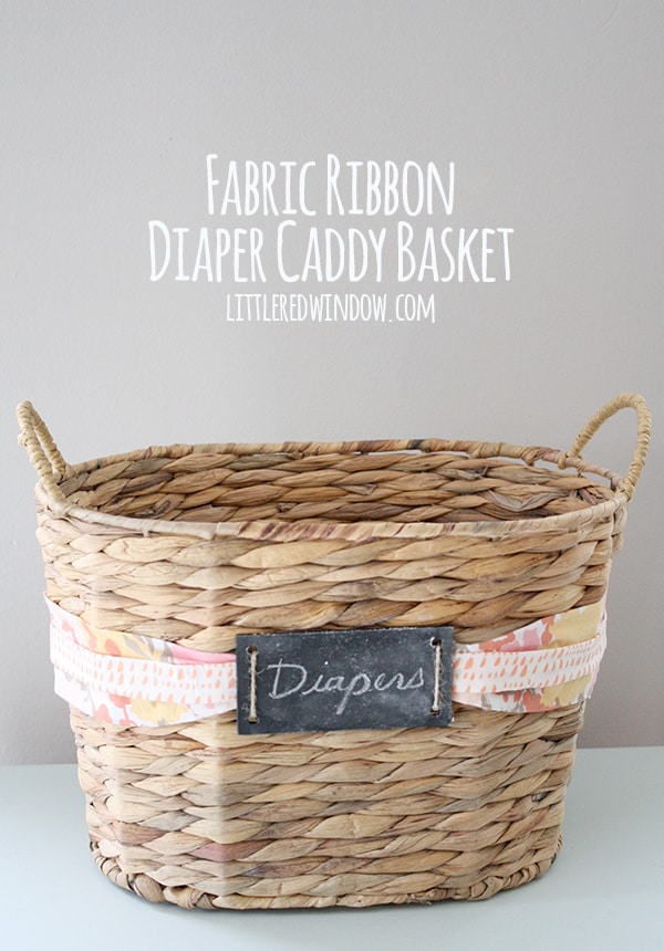 Customize a boring basket with fabric ribbon and use it as a convenient place to stash diaper supplies! If you’ve had babies, you know that everyone tells you that you need a changing table and a fancy changing pad in the nursery (you don’t, just use the top of a dresser) but what they don’t tell you is given how many times a day you change a diaper, especially for new babies, you are not going to want to walk to the nursery every single time. When we had O, we lived in a reasonably small condo and we still didn’t always want to walk all the way down the hall to his room. So we kept some diaper supplies in the living room so we could change him on the couch or the floor or in our bedroom.