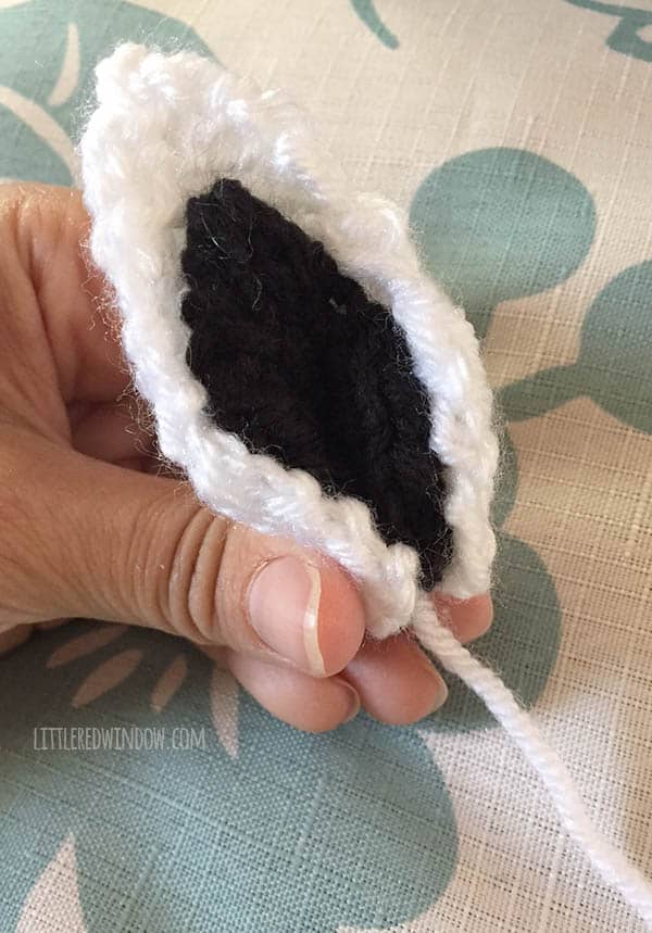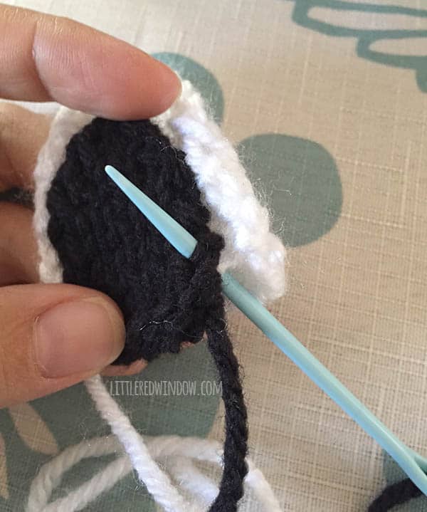 To make the stripes, follow this pattern for 4 rows with white yarn, switch to black and follow for 4 rows and repeat until the mane is as long as you want it. My mane has 13 stripes.