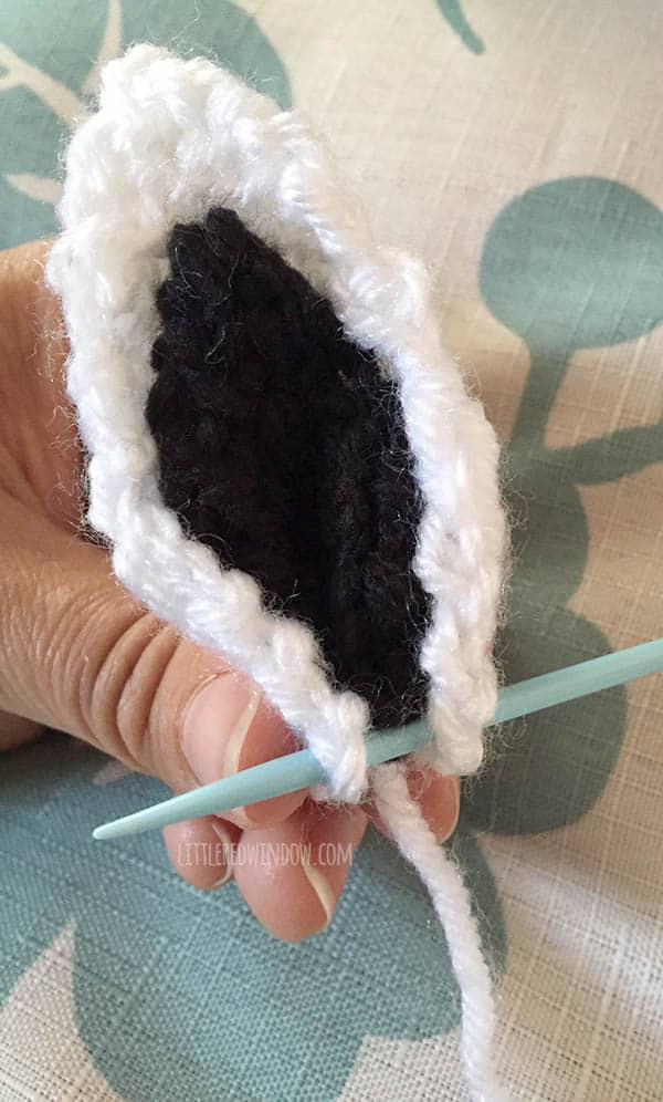 To make the ears, lay one black inner ear, purl side DOWN on top of one white outer ear (which has purl side UP), use the long black cast on tail of the inner ear to stitch them together. Be sure your stitches only catch purl loops on the white outer ear and do not show through to the back of the ear. Then pinch the ear at the base and use the white cast on tail to put one stitch through the bottom to help it hold its shape. Finally, still using that same cast on tail, stitch each ear securely to the hat on either side of the mane. And that’s it! The PDF printable also contains instructions for sizes 0-3, 12 months and 2T+!