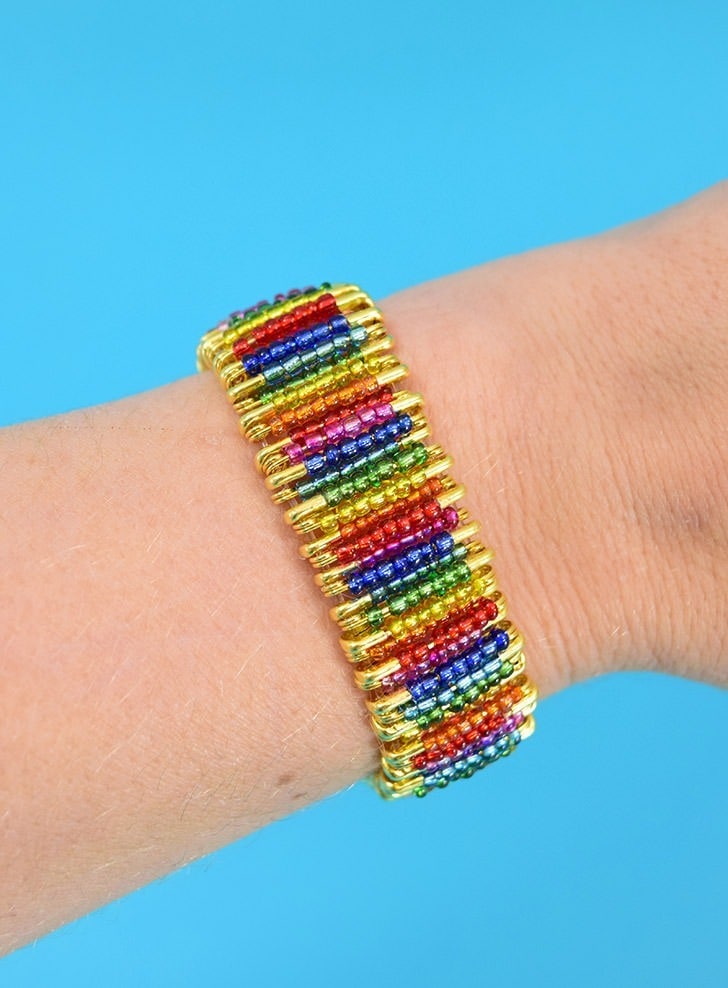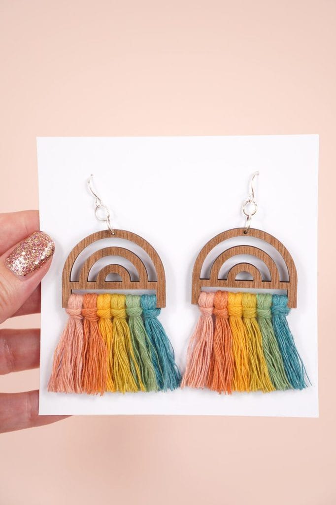 This bright and fun rainbow wall hanging is made from painted wooden beads and yarn pom poms, it's the perfect pop of joyful color!