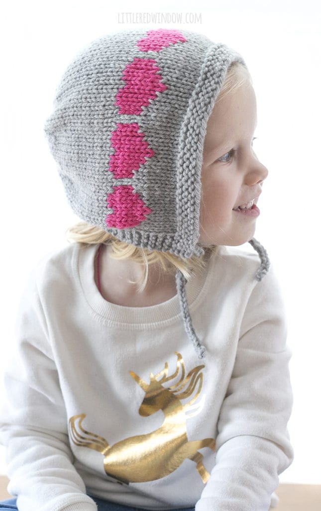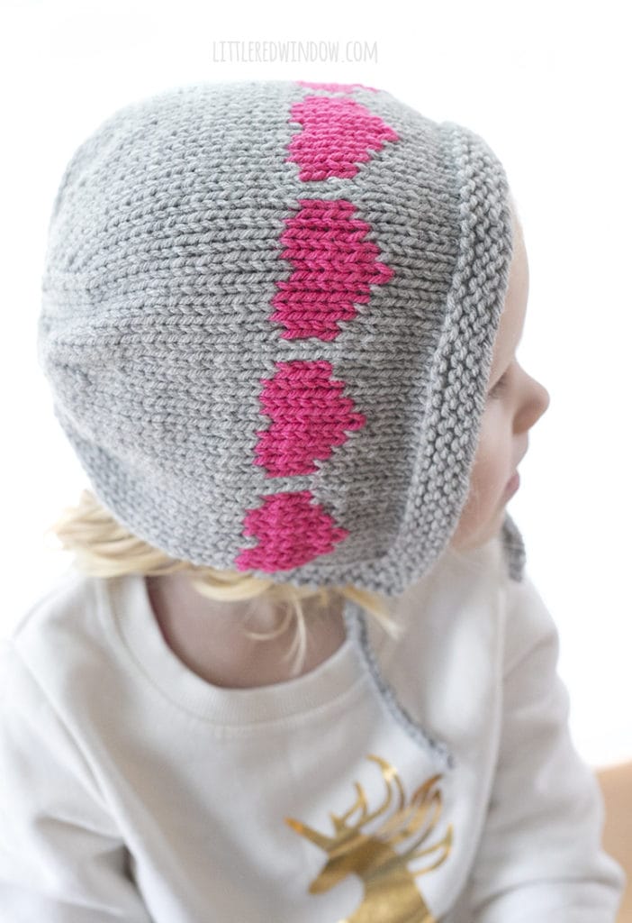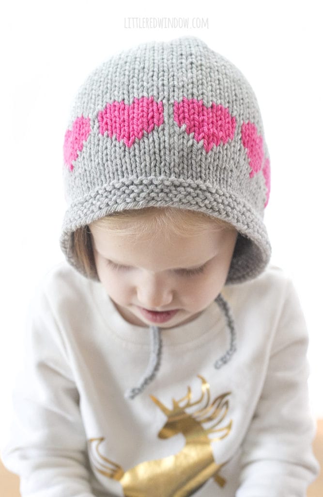 This adorable baby bonnet knitting pattern features a row of colorful colorwork hearts and cute and functional chin ties!