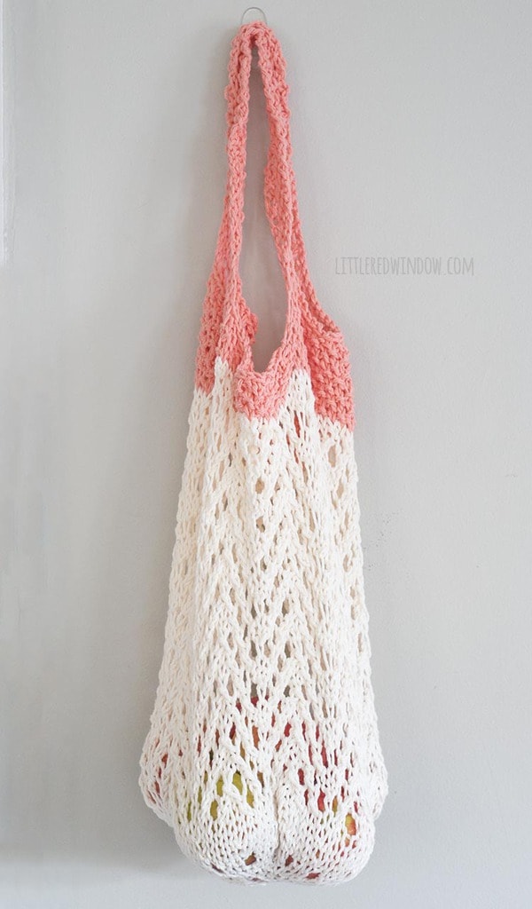 Anyway, this adorable bag is knit with cotton yarn which makes it super sturdy and durable, it’s very stretchy and perfect for carrying produce or whatever you pick up at the farmers’ market.