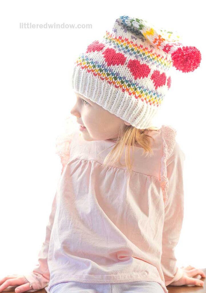 This adorable rainbow love stocking cap knitting pattern for babies and toddlers includes a fun rainbow colored fair isle design that goes all the way to the very top!