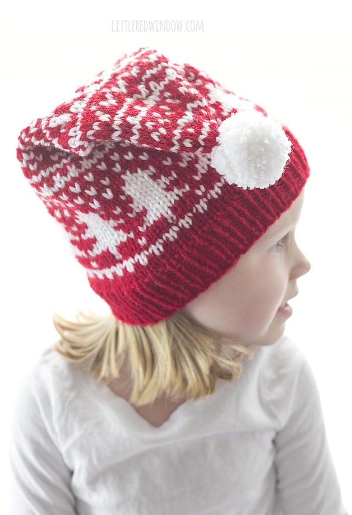 This pretty wintry fair isle stocking cap knitting pattern has a fun fair isle pattern of trees and fair isle motifs in red and white worsted, it’s a fun knit to make for your little one!