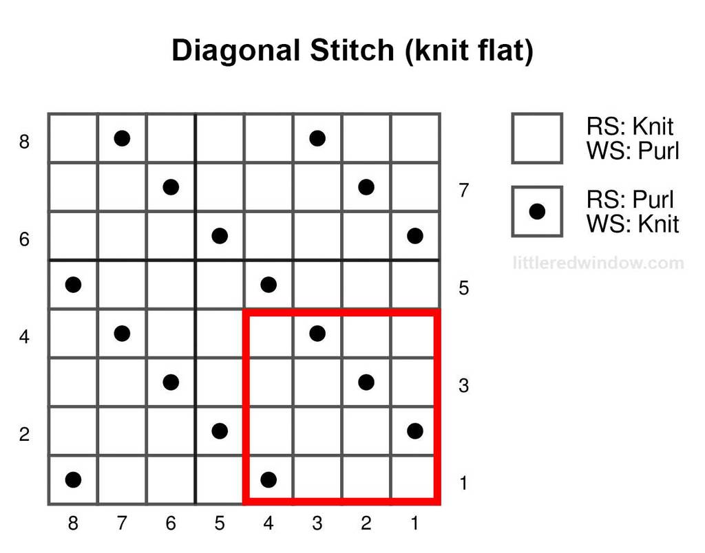 Here is a chart showing how to knit diagonal stitch flat: