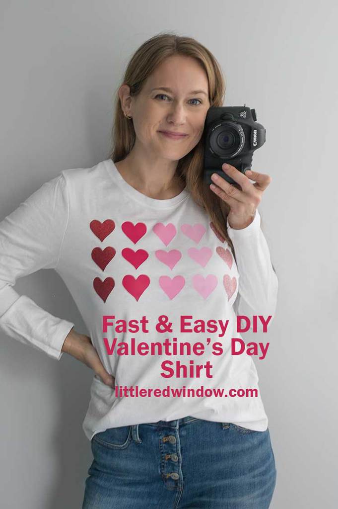 Hey there, can you believe I put my face on the internet? It’s been a while! But I wanted to share my quick and easy DIY Valentine’s Day Shirt and my usual younger, cuter model wasn’t available (and also, it wouldn’t fit her). So you get me instead, ha!