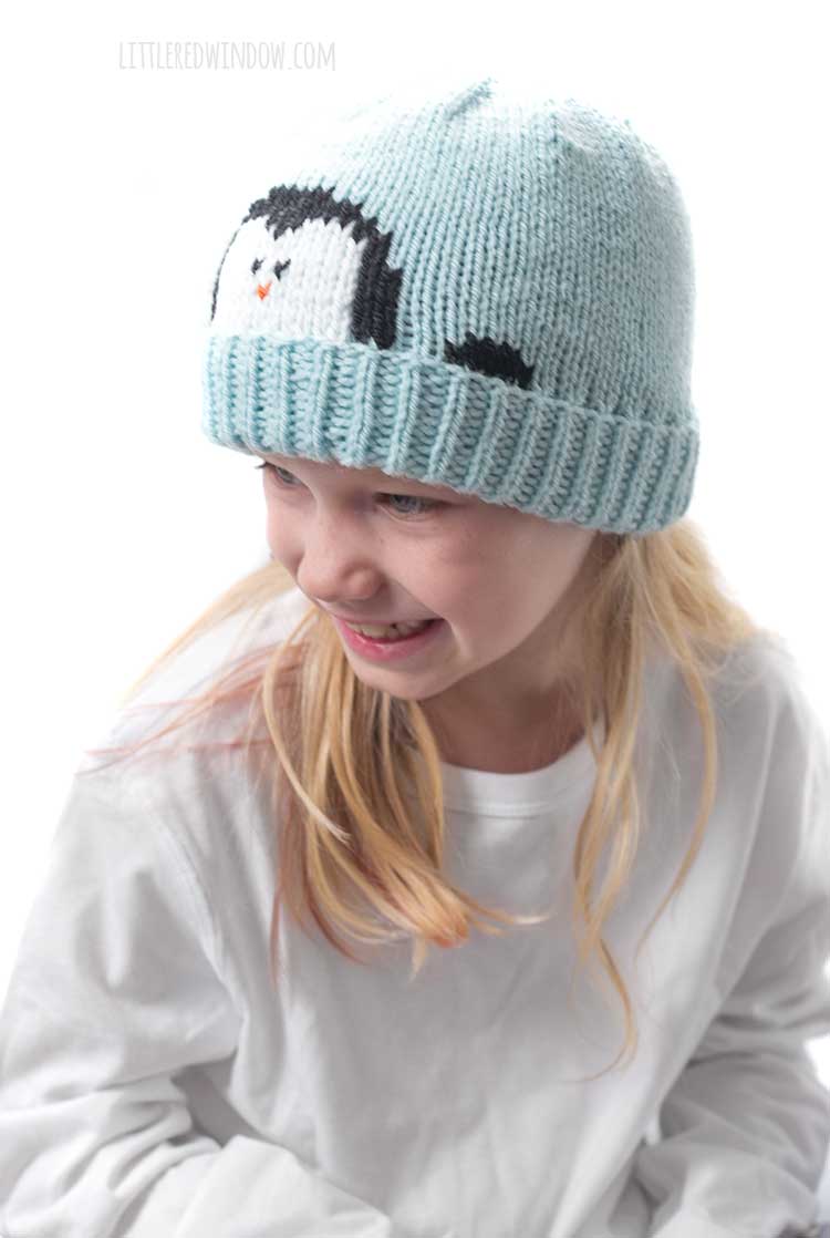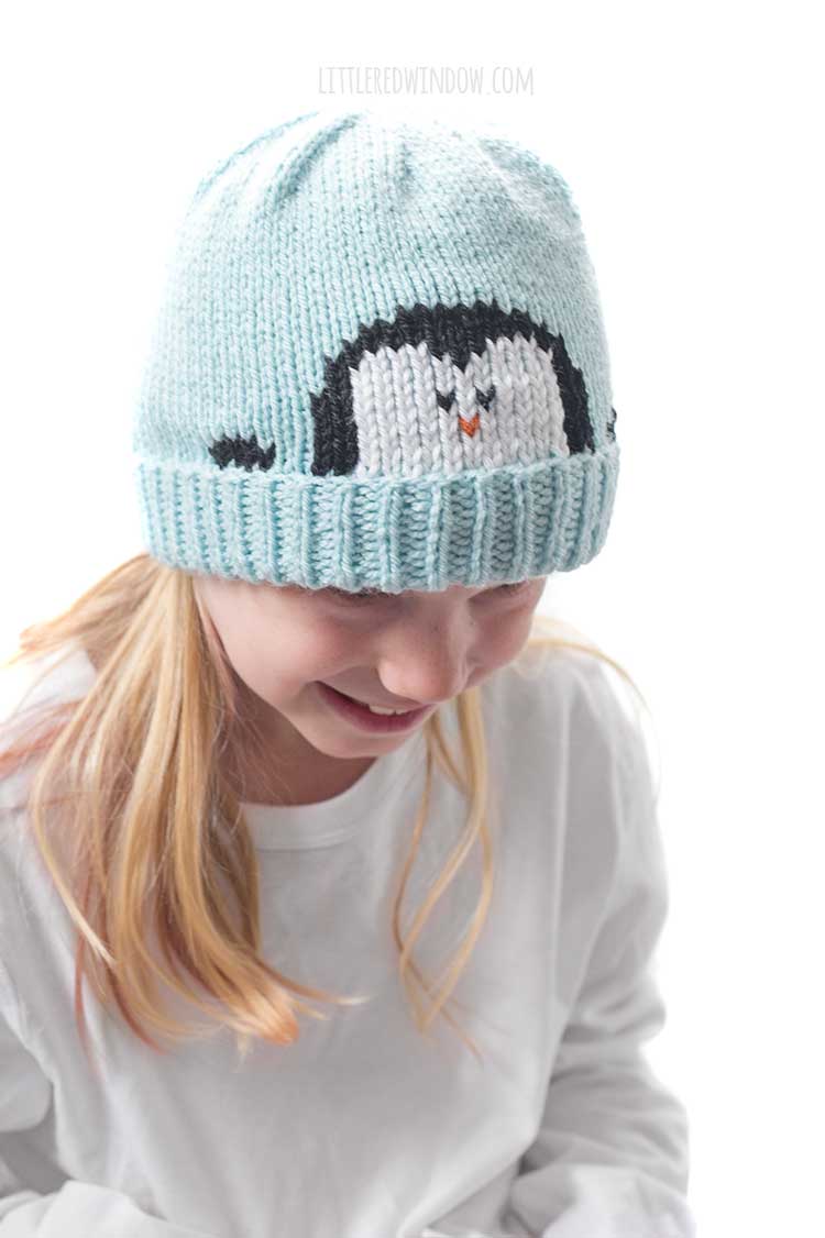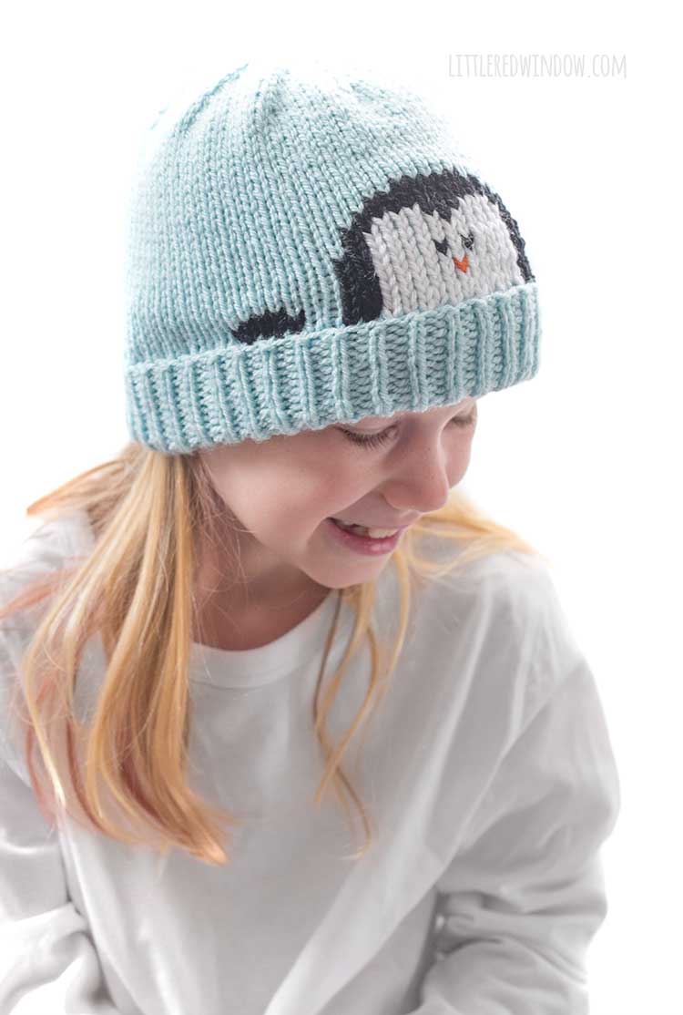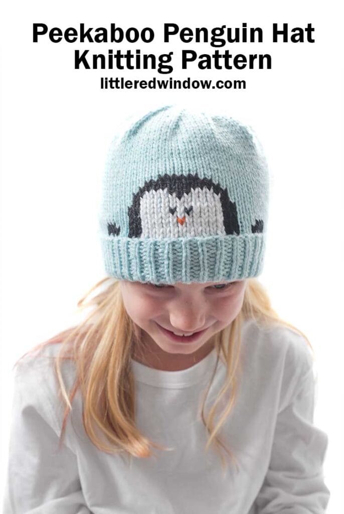 This adorable duplicate stitch knitting pattern, the Peekaboo Penguin Hat knitting pattern has a cute little penguin peeking out over the folded brim!