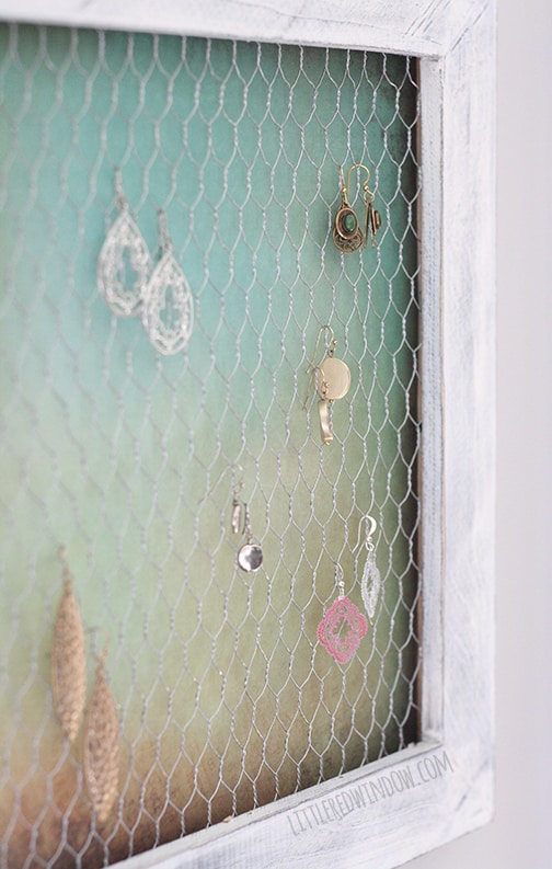 7. Finally I hammered in the sawtooth picture hanger that came with my frame and I was done! Hang it on the wall and hook your earrings over the chicken wire to display them!