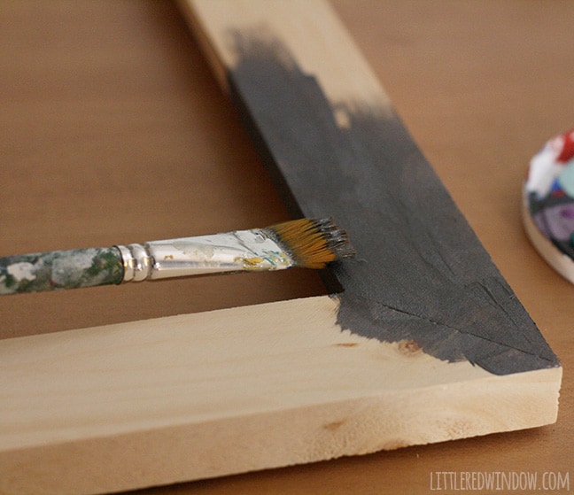 1. First I gave my wood frame a light sanding. Mine didn’t come with glass or plastic inside, but if yours does, remove that. Then I gave it a coat of a dark charcoal color. This was Martha Stewart’s Gunmetal which is actually metallic.