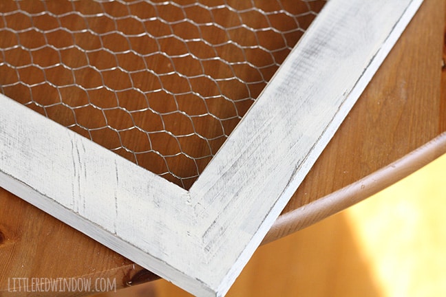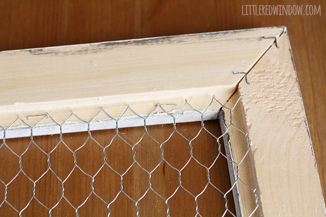 4. Next flip the whole thing over. I happened to buy a flat piece of pre-cut 12″ x 12″ chicken wire at the craft store that was meant for scrapbooking. I am 100% sure this in NOT the most economical way to buy chicken wire. But it meant I didn’t need wire cutters and have a ton of chicken wire leftover, so you know what? I bought it anyway. I laid that in the back of the frame and used my staple gun to secure it.