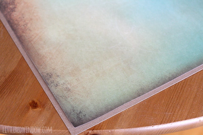 5. Next I took a piece of thin cardboard that was about 1/2″ wider than opening in the back of the frame and used to double stick tape to attach my scrapbook paper in the center. I’m obsessed with this scrapbook paper which is kind of a corrugated rusted metal but also looks sort of like a sunset. It makes my architect heart happy. But you can use whatever color or print you want!