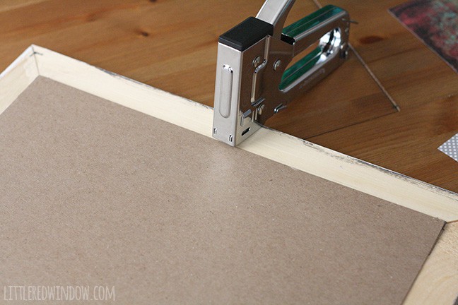 6. Then I put the cardboard over the opening on the back of the frame and stapled it on. Make sure you are putting it OVER the opening and not inside because you want a good gap between the chicken wire and the backing for your earring wires to fit!