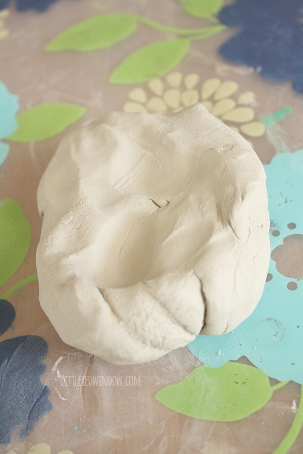 1. Open your clay and pull of about 1/4 to make the largest nesting dish. (A caveat about the clay. Altough the picture on the front and the description say it’s white, in reality, it’s kind of tannish/light brown. It does dry significantly lighter in color though, so don’t panic!)