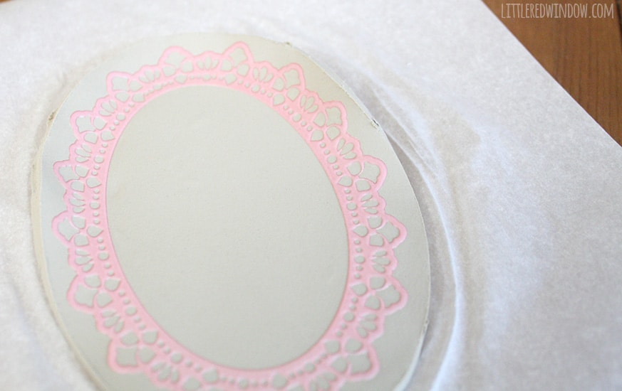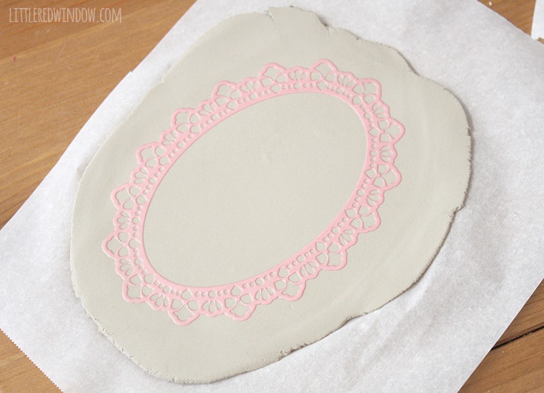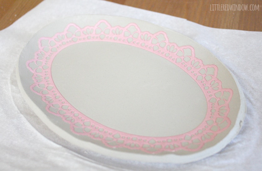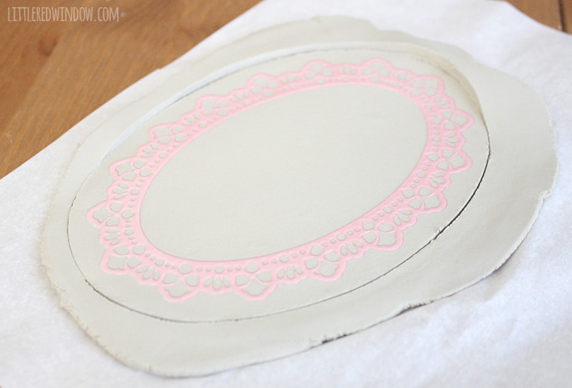 3. I tried this multiple ways including leaving the scrapbook sticker on its backing and planning to stick it on when the dish was dry, but, surprise! Turns out the best method is to just stick the sticker right onto the wet clay! Gently press it into the clay with your fingers4. Cut around the sticker, leaving a small border, with your knife or clay tool.5. Remove extra clay from around the edges. 6. Using your fingers, gently, gently start to go around and bend the edges of the dish upwards. This will take some time to get it even all the way around. This pic is just as I was starting to do that.7. When your edges are shaped, used a tiny bit of water on your fingers and smooth out any rough spots. 8. Allow your dish to dry according to the package directions. Mine took about 24-36 hours. Repeat with the other sizes of scrapbook stickers to make three nesting dishes.