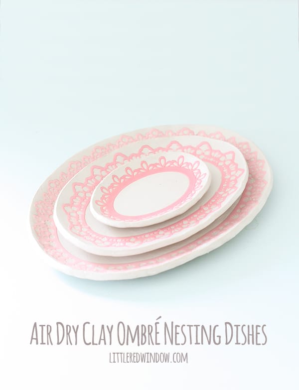 So I randomly grabbed these pretty ombre scrapbook stickers at the craft store a few weeks back. If you you open them up, they’re actually made of some kind of rubbery material with a sticky back. They’re not paper. I had no plans for them. Until one day I saw them sitting next to a new package of clay I ordered and a lightbulb went off. You see, I have a thing for nesting dishes. They’re just so cute and adorable and pretty! I do not, however, have a thing for the price of nesting dishes. I always get so excited when I see them on Etsy or in a store and then I peek at the tag and have a heart attack. I mean, I get that they’re a lot of work to make, but geesh! So I came up with a crazy plan to make my own. I thought they’d look cute sitting on my dresser. Enter the air dry clay. It’s probably not as sturdy as the kind of clay you bake in the oven, but you know what? It’s easier to deal with. And there are no stinky oven fumes. So that’s what I went with. The last time I used air dry clay, I used a different brand and, let me tell you, this brand is so much better. That’s my official review. And here’s how I made these pretty Air Dry Clay Ombré Nesting Dishes!