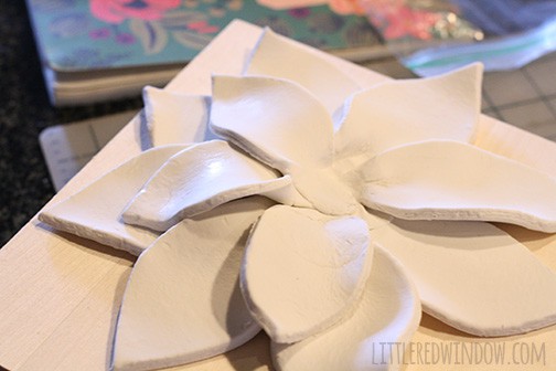 I’d say mine is about 8 inches square. And the clay came in a package of 2.2 lbs (1kg). But I’m pretty sure I didn’t use the whole thing. The flower is fairly heavy though. And the bigger you make it the longer it will take to dry. We moved in the middle of making this so mine dried for over a week. And you won’t want to try to glue it to the wood until it’s 100% dry or it will probably fall off or fall apart. I haven’t tried it but I wonder if maybe some of that light weight modeling clay you can find might be better for you? Maybe do a trial run with some of that? Let me know how it goes! Cassie