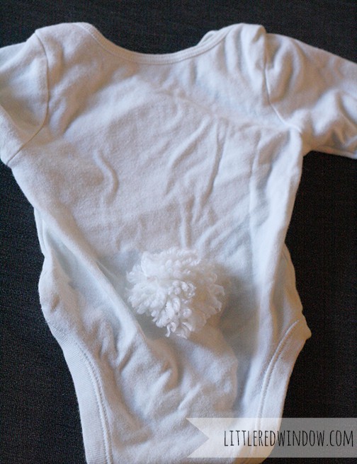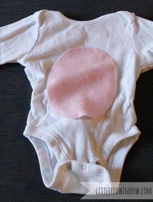 The hands and body were easy. For the onesie, I cut an oval out of pink felt and stitched it to the front to be a cute little belly. Then I made an easy white yarn pom pom and stitched it to the back. O was still in the stage where we held him a lot,if you had a little one who spent a lot of time lying down in a swing or bouncy chair or something, the tail obviously wouldn’t be comfortable for them.