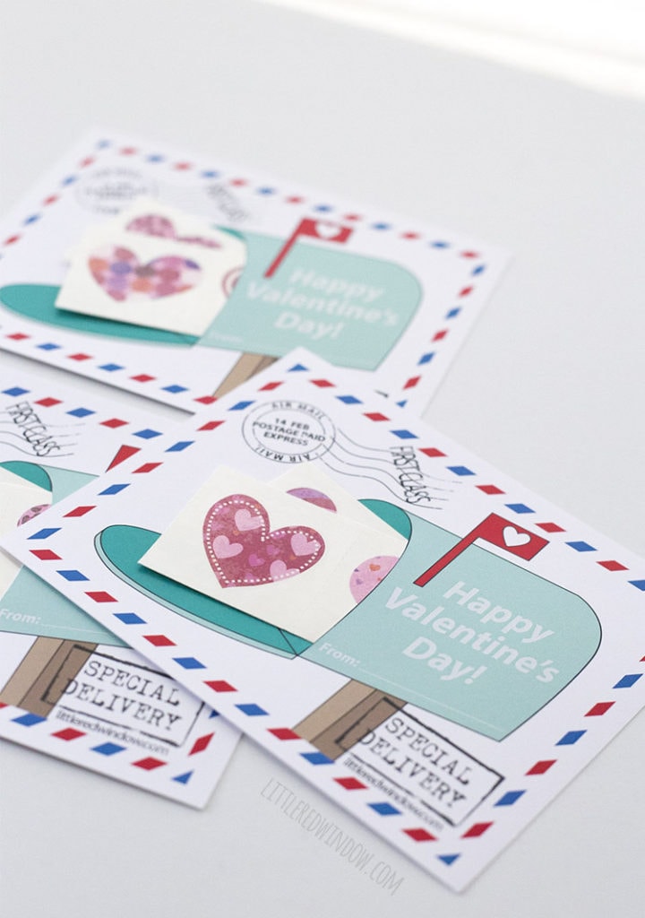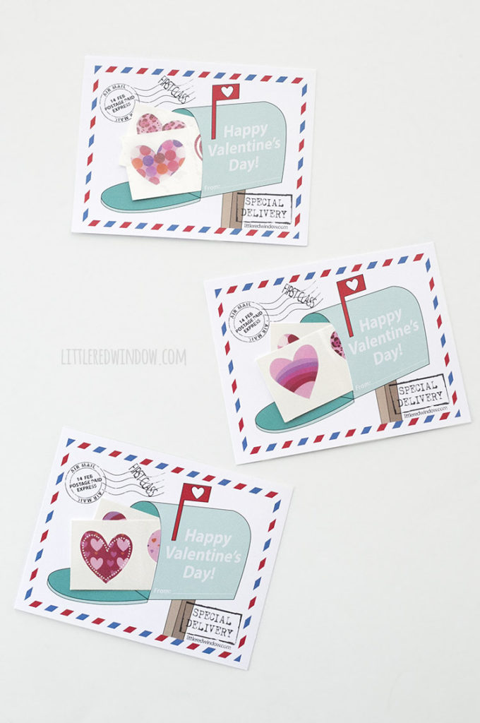 These cute free printable mailbox valentines are SO easy to put together, just print, cut and put stickers or tattoos in the mailbox as “mail”!