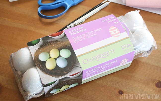 So, as a result we have never really dyed Easter eggs with O before he was about 4. But then I saw these craft eggs at the store and grabbed two dozen! They’re perfect for making Easter Bunny Eggs! I love that they’re already white, I love that they won’t break, I love that there are no leftover eggs to deal with, I love that you (I’m sorry, I mean the Easter Bunny, ahem) can hide them and not worry about a stinky surprise if you forget where you/he/she put one, and I love that they come in a real egg carton, so cute! (And bonus points for being an awesome alternative for people with egg allergies!)