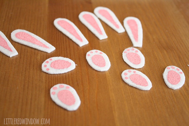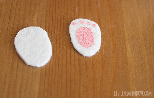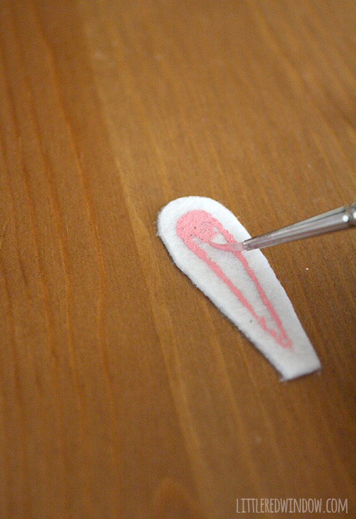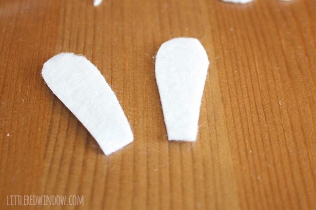 1. First, using scissors, I cut out ears shaped like this from the stiffened felt, mine are about 1 1/4″ long.2. The felt I used had one side that was slightly smoother, so I painted pink inner ears on that side using a small paintbrush.3. Then I cut small ovals for the feet. These are about 3/4″ long and 1/2″ wide.