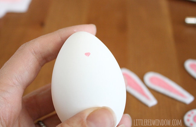I’m not totally sure what they’re made of but they leave a bit of chalky residue on your fingers when you touch them so I’m thinking maybe plastic covered in plaster? Or something similar that would absorb egg dye? We haven’t tried the dying them yet so the jury’s still out on that, but they were fun to use for Easter Bunny Eggs! Here’s how I made these cute bunny eggs: