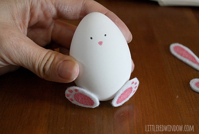 5. Then, using hot glue, I glued the feet to the front of the egg. Make sure they touch the table, they help hold him up.