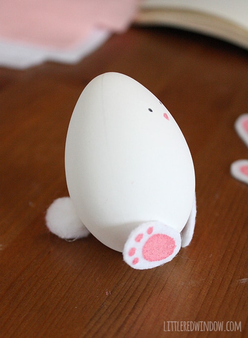 6. Then while the bunny egg is sitting on the table (you still have to hold it up at this point), glue a small pom pom to the back for the tail. Now you should have two feet and one pom pom touching the table which should keep your bunny eggs upright!