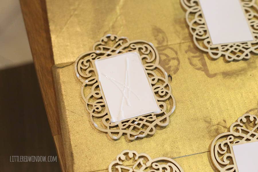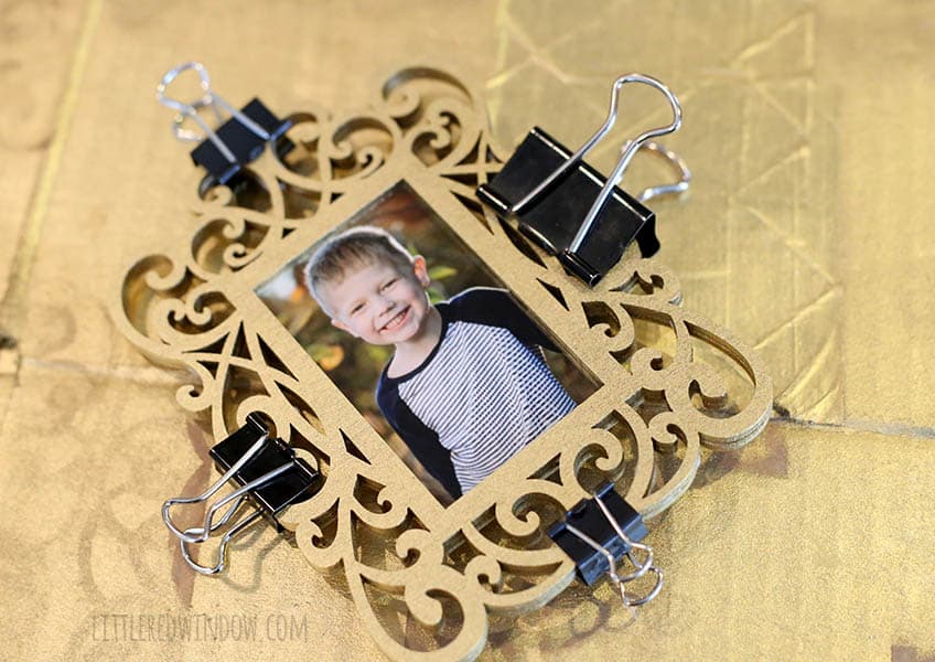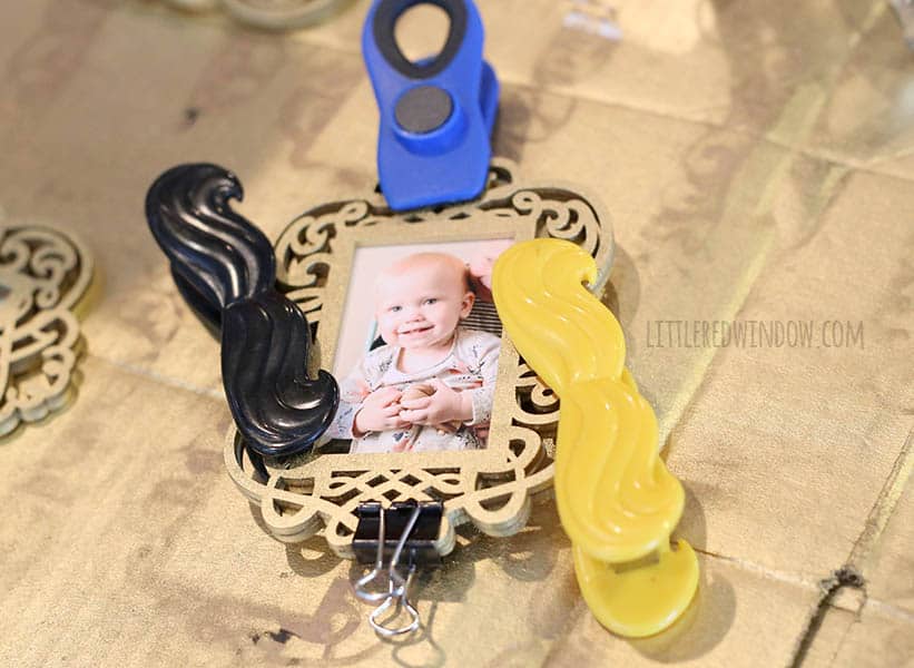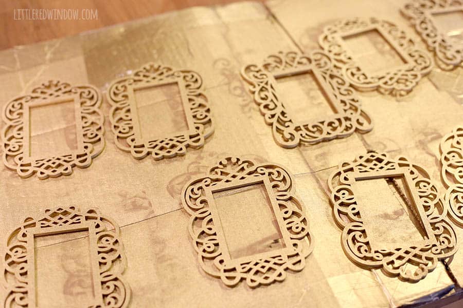 - While I was cutting them out, Aa gave all the frames two even coats of gold spray paint. You only have to paint one side but make sure to get all the edges and nooks and crannies!