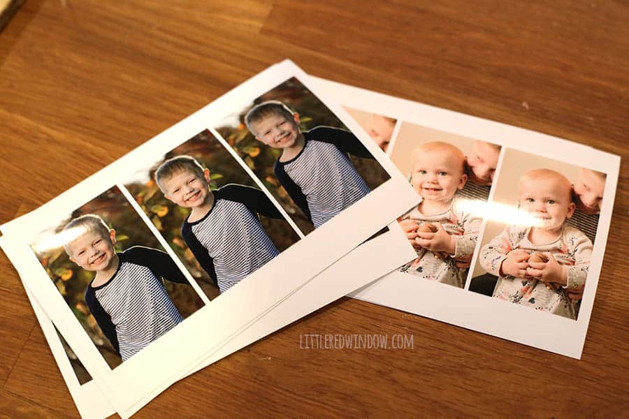 - First measure the opening in your wood frames. You will need to overlap a little bit on each side to glue the photo in so I had my picture printed to 1 3/4 inches by 2 3/4 inches. I did this by sizing them in photoshop (you can use a free program like picmonkey if you don’t have photoshop) and then having them printed 3 to a 4 x 6 print at my local photo counter.