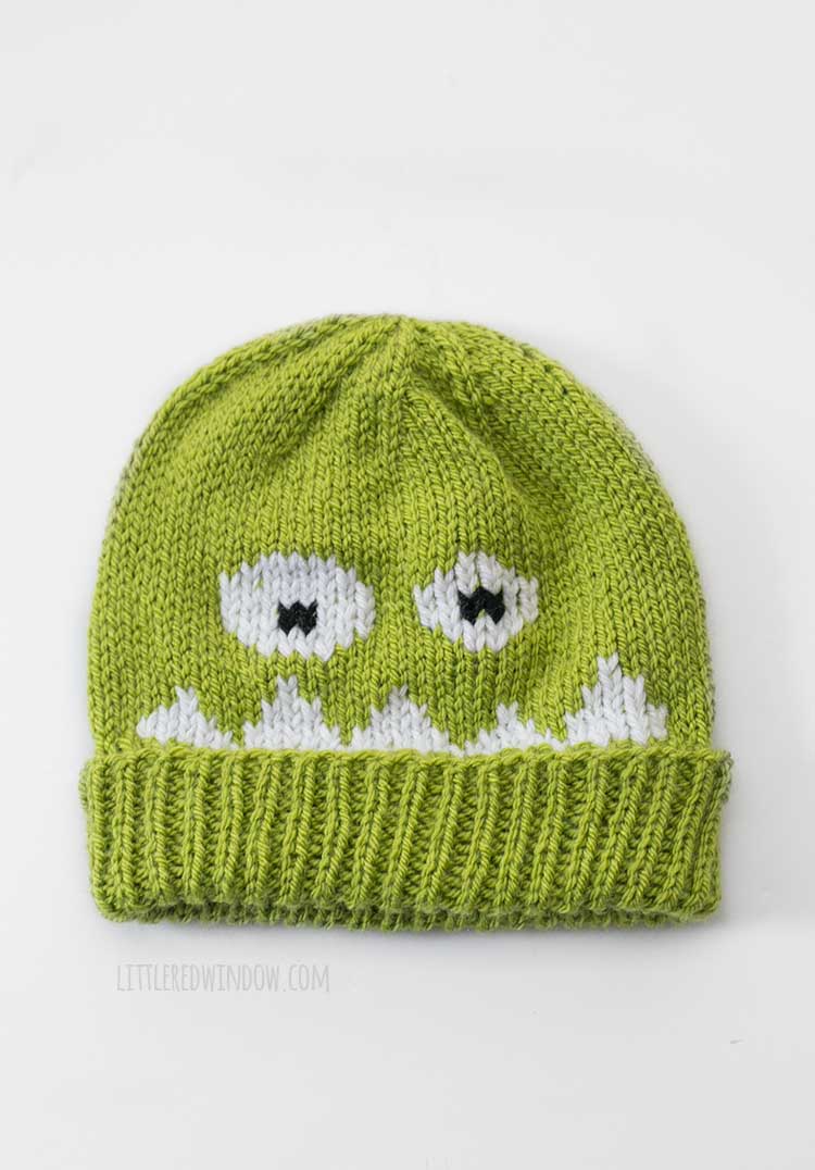 This cute and silly monster hat knitting pattern has a thick cozy double brim and a silly monster face in duplicate stitch!