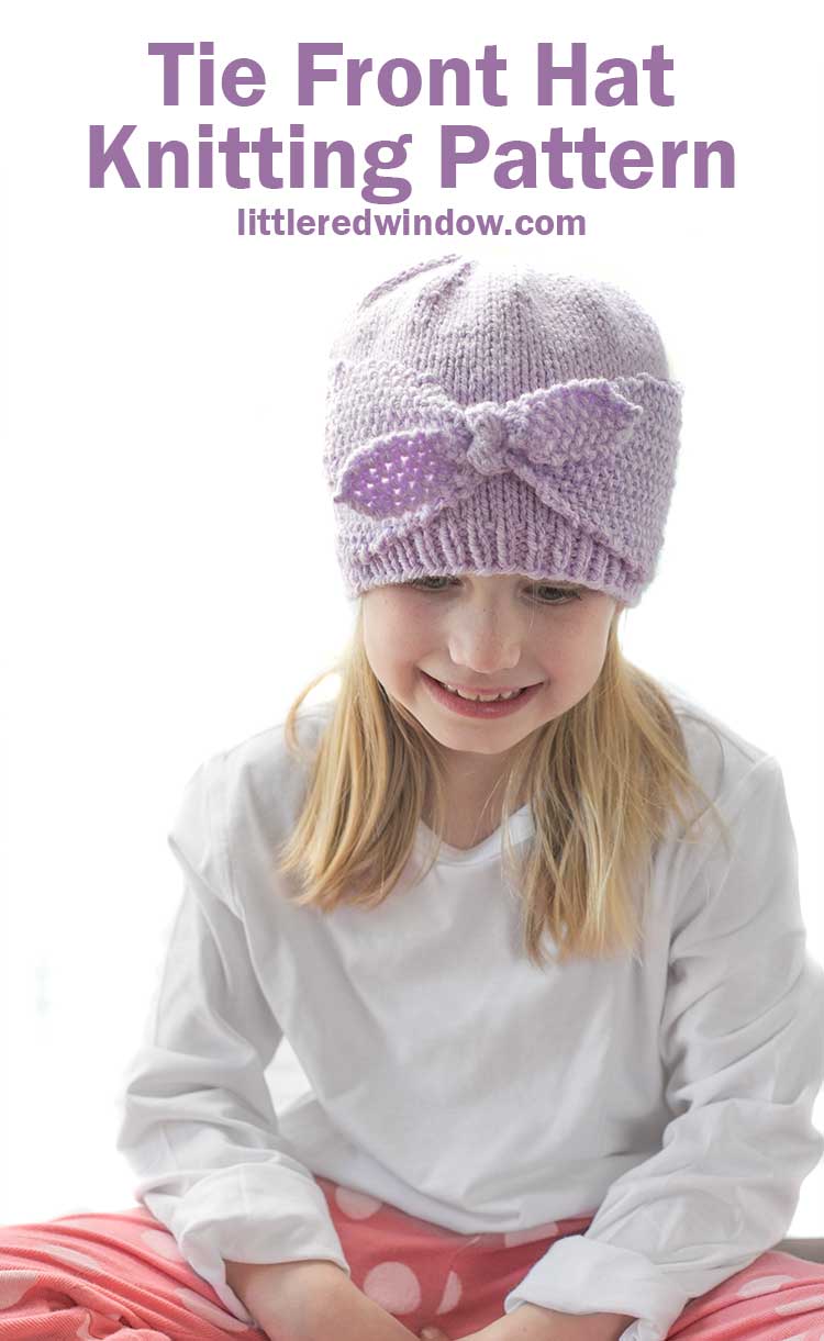 The tie front hat knitting pattern has a cute seed stitch tied bow in the front center, it’s an adorable knit for your little one!