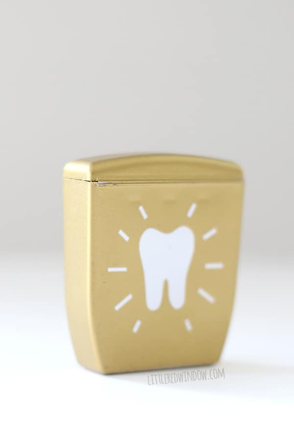 5. Apply the vinyl to the dental floss container and rub all over to make it stick. Then carefully peel off the contact paper. 6. I also added another little tooth shape to the back of the container just for fun. And that’s it!