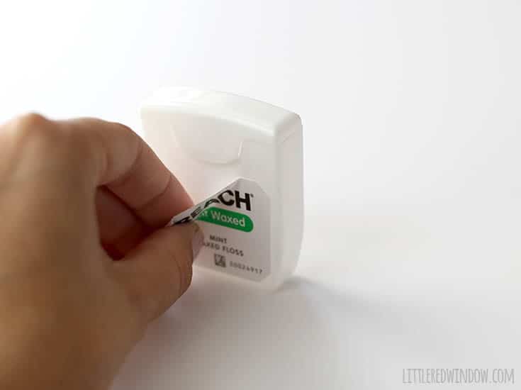 - First, peel off any stickers or decals on your dental floss container.