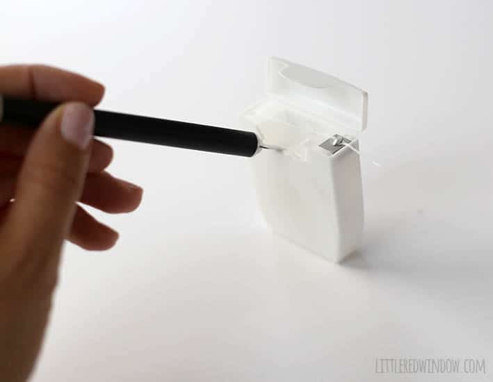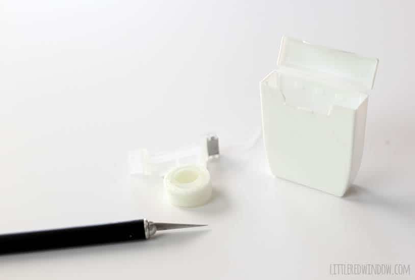2. Then use a craft knife or something similar to pop out the internal dental floss mechanism. Mine came out very easily. If it isn’t empty, set the floss aside to keep using!