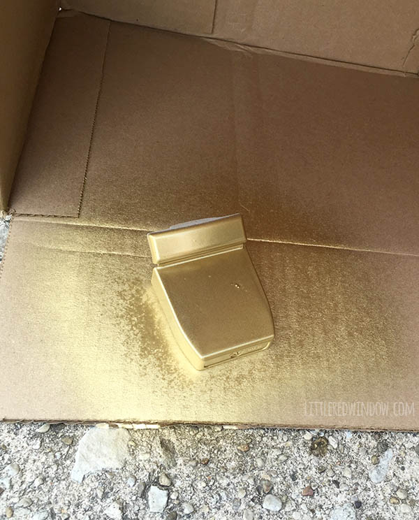 3. Take your floss container outside and give the entire thing a good coat of spray primer. I tried doing it without primer and the paint peeled right off. Make sure your primer says it’s appropriate for plastic. When it’s dried according to the primer’s directions, give it several thin and even coats of gold spray paint. Don’t forget to open it up and get inside the lid!