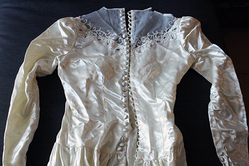 I have my mother-in-law’s dress that is over 80 years old and has satan buttons down the sleeves and back. Should I make mini dress ornaments or just make ornaments from pieces as no one will ever wear this dress?
