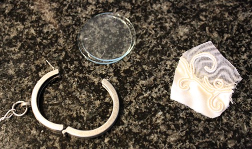 As you can see in the (terrible) picture above, it had a little latch on once side that opened up the circle on a hinge. Then there were two rounded pieces of glass that fit inside. I just cut a little scrap of the dress, put it between the glass (with a few tiny spots of clear glue to keep it from sliding) and put it all back in. (This particular pendant is no longer available but here’s something similar I think would work if you took the charms out.) Then I added a little super glue to the latch so that it wouldn’t accidentally open and break. Here’s the finished product!
