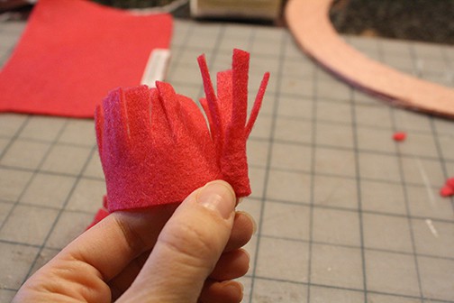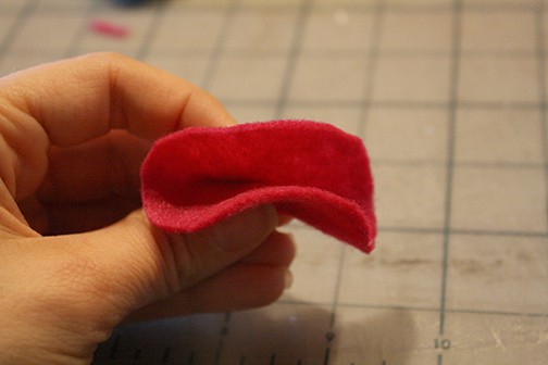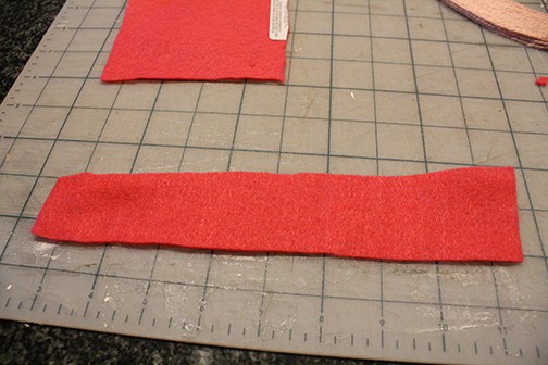 Cut a long, gently sloping strip of felt. It should be about 1/2 inch shorter at one end than the other. My felt was 9″ x 12″ so my strips were 9″ long.