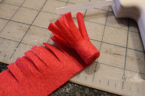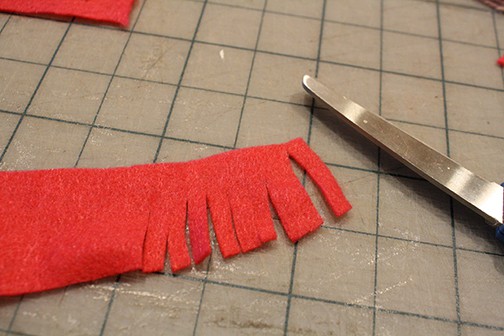 Next, cut the strip into fringe. My fringe was about 1/8-1/4 inch wide. Again, you don’t have to be exact. Cut down about 3/4 of the way through the strip.