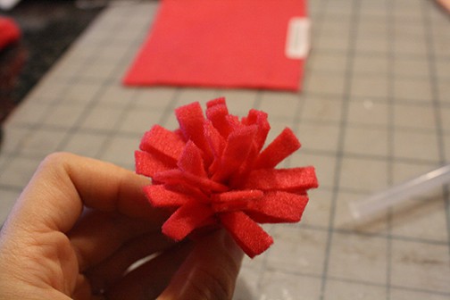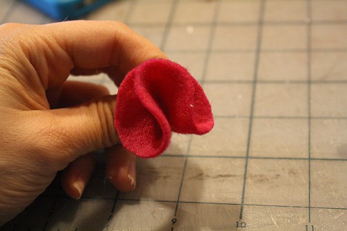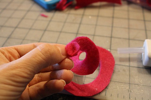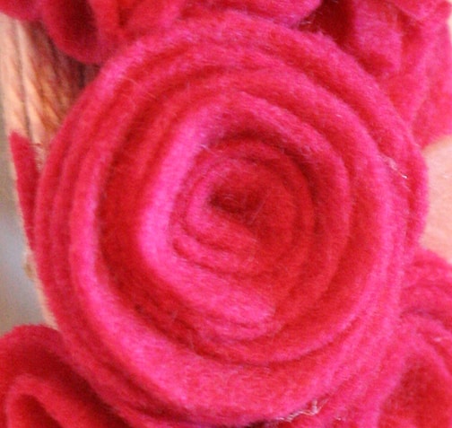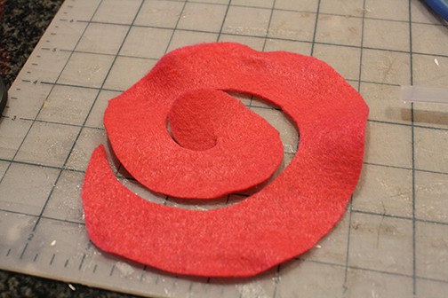 Starting at the center of the spiral, wind the felt up around itself, periodically securing with hot glue as you wind to form a flower.