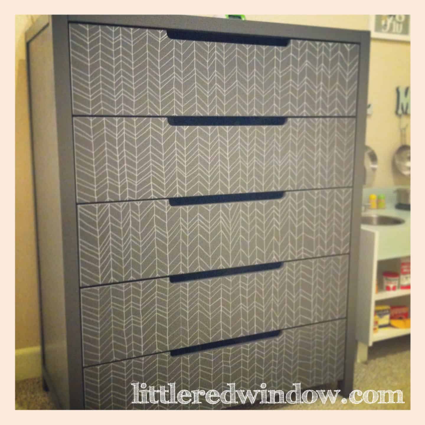 I had painted it a dark eggplant color but after several years of a chubby cat climbing up and down the front it was pretty much ruined. I don’t have a picture of it but trust me, it wasn’t pretty–lots of deep scratches and peeling paint. When O moved from his tiny nursery into his big boy room I decided to drag this dresser out of a closet where it was holding sheets and towels and turn it into his big boy dresser. I searched Pinterest and found some inspiration. I liked this a lot:
