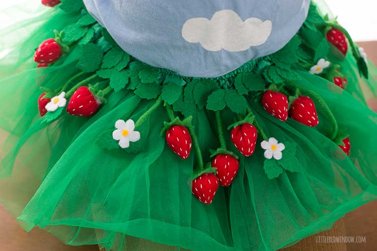 Then I cut out a bunch of small white felt flowers and glued tiny yellow felt dots to their centers with craft glue. When they were dry and my strawberries were finished, I used strips of green felt (I doubled them to make them stronger) sewed to the berries as stems and sewed on the green felt leaves and then sewed everything to the top waistband of the green tutu.