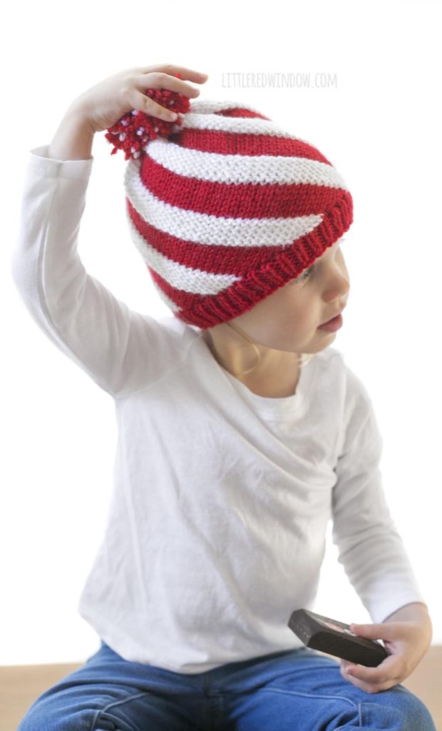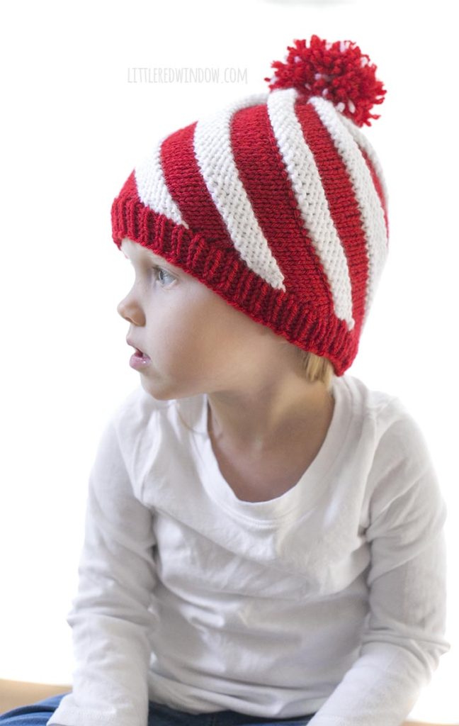 This fun peppermint twist hat knitting pattern has bold red and white stripes swirling up to a cute speckled pom pom on top, just like a peppermint candy!