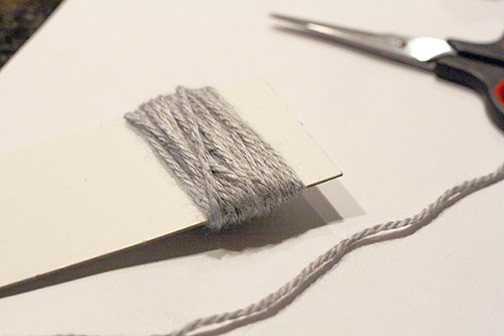 Find a piece of stiff cardboard that is about 2 inches wide. Using the blue yarn, wind the yarn around and around the cardboard about 40-50 times.