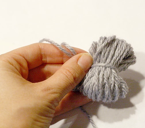Slide the yarn off the cardboard and tie it around the middle very tightly with a piece of yarn that is about 12 inches long.