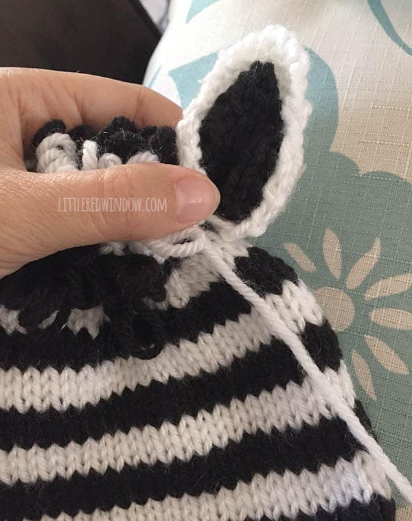 To make the ears, lay one black inner ear, purl side DOWN on top of one white outer ear (which has purl side UP), use the long black cast on tail of the inner ear to stitch them together. Be sure your stitches only catch purl loops on the white outer ear and do not show through to the back of the ear. Then pinch the ear at the base and use the white cast on tail to put one stitch through the bottom to help it hold its shape. Finally, still using that same cast on tail, stitch each ear securely to the hat on either side of the mane. And that’s it! The PDF printable also contains instructions for sizes 0-3, 12 months and 2T+!