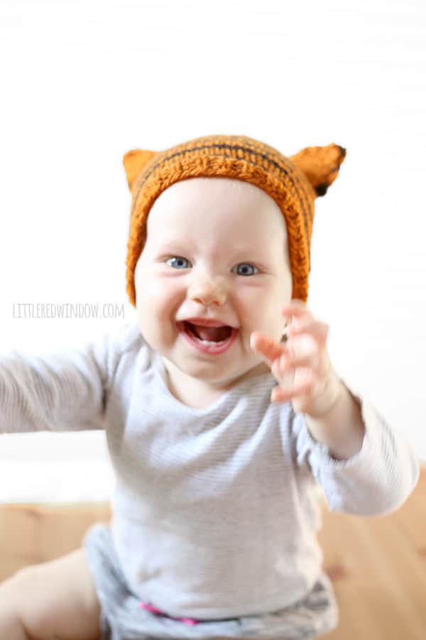 Oh you guys, every hat I make immediately becomes my new favorite. For a while, I was SURE my fave was the Koala hat but, boy, is this little tiger hat cute! Orange is definitely not usually my first choice of colors for much of anything, but I love it for this fierce little tiger hat! Ok, maybe fierce is kind of stretching it. Let’s see Baby V’s toughest tiger ROAR face…